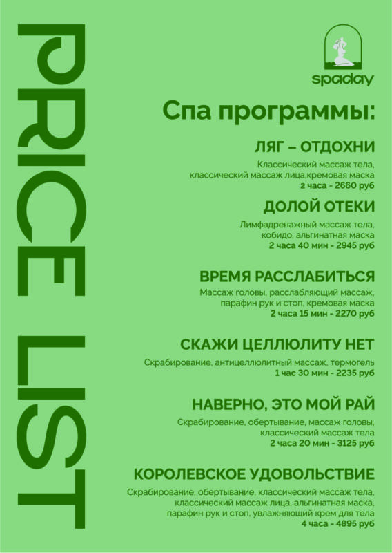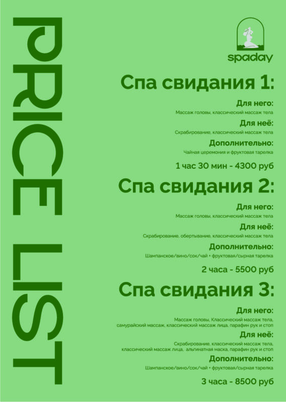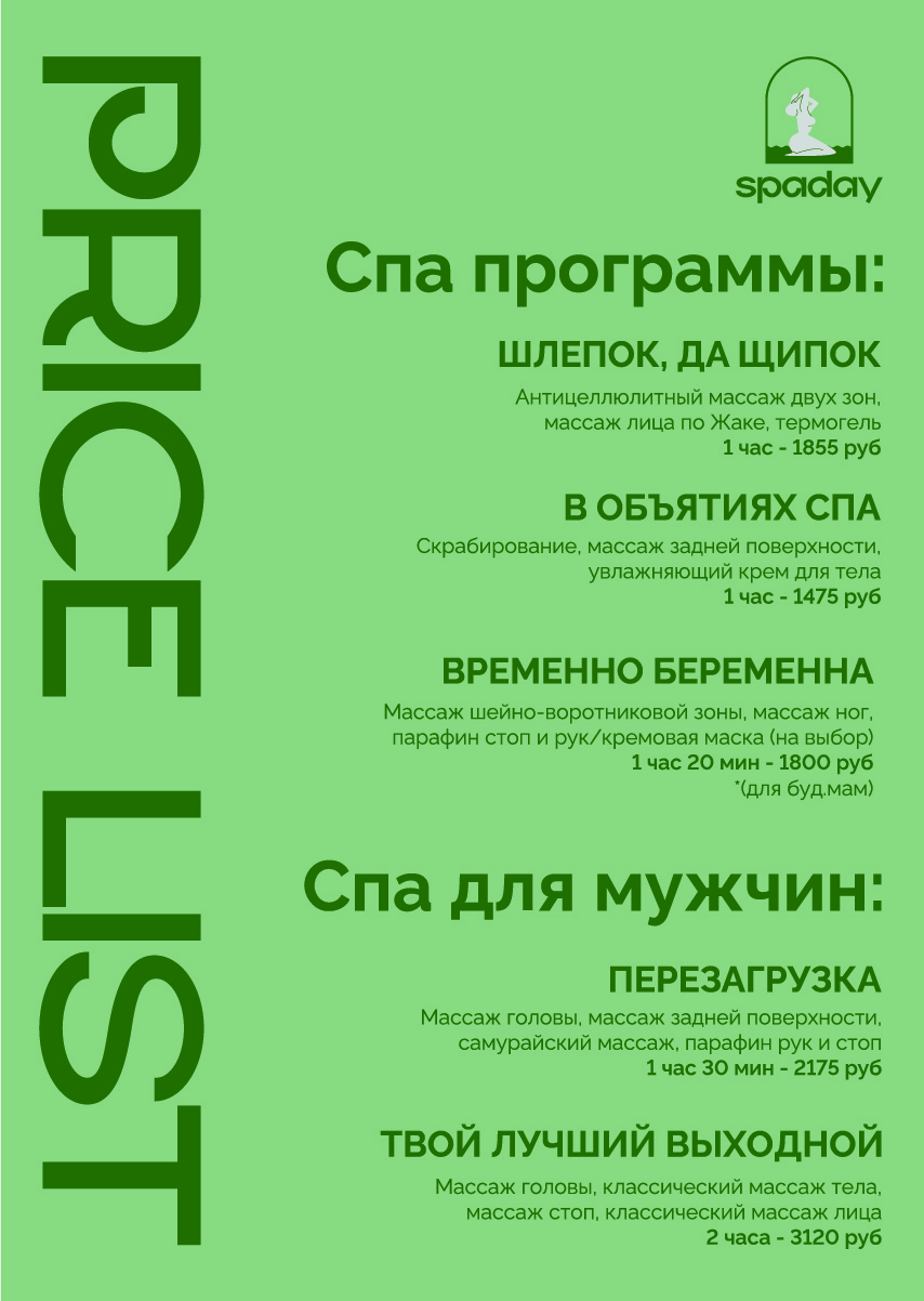 Студия массажа «spaday» предоставляет услуги массажа тела и лица, спа программы, парные массажи и спа-свидания. Также можно приобрести подарочные сертификаты и абонементы.